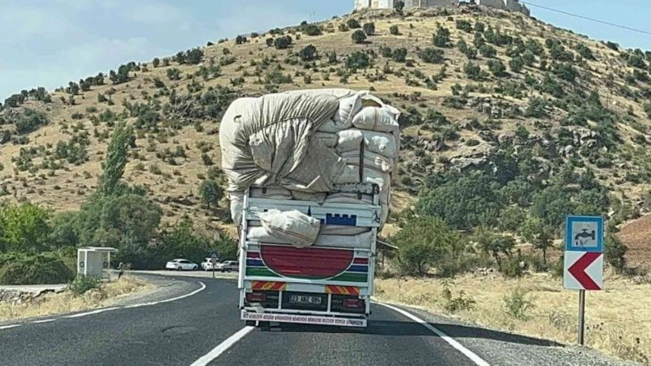 Diyarbakır'da aşırı saman yükü ile trafikte seyreden bir kamyonet çevresine tehlike saçtı. O anlar bir vatandaşın kameralarına böyle yansıdı.