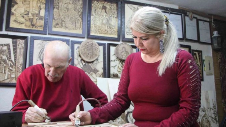 Hatay’da hobi olarak başladıkları yakma resim sanatı sayesinde tanışıp evlenen ve zamanla işlerinde ustalaşan Zeynep-Naim Gülbol çifti, eserlerinde hem aşklarını hem memleketlerini ahşabın üzerine milim milim işliyor.