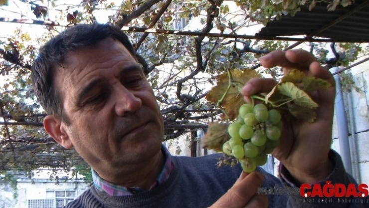 Yaprakları kurumaya başlayan asmadan yaklaşık 10 salkım üzüm çıktığını gören iş yeri sahibi Yakup Boncuk, “Ülkede kar kış kıyamet yaşanırken asmamız üzüm verdi” dedi.