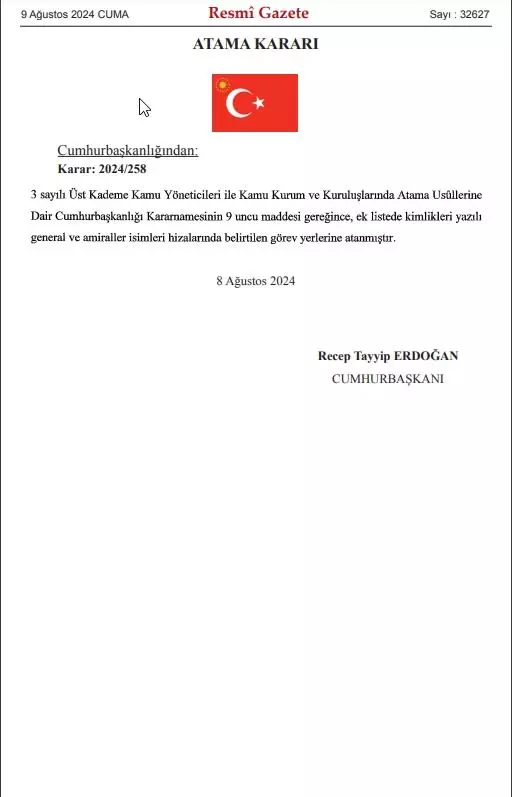 Cumhurbaşkanı Recep Tayyip Erdoğan imzasıyla, Kara, Deniz ve Hava Kuvvetleri komutanlıklarına bağlı 187 general ve amiralin atama kararları Resmi Gazete'de yayımlandı.