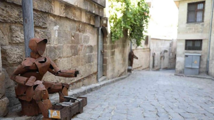 Gaziantep Büyükşehir Belediyesi, kent merkezindeki tarihi Bey Mahallesi'nde 'Hayat Sokağı' olarak adlandırdığı 135 metrelik alana, atık demir malzemeleri kullanarak yerleştirdiği yaklaşık 30 heykel ile bölgenin kültürel ve sanatsal görünümüne canlılık kazandırıyor.