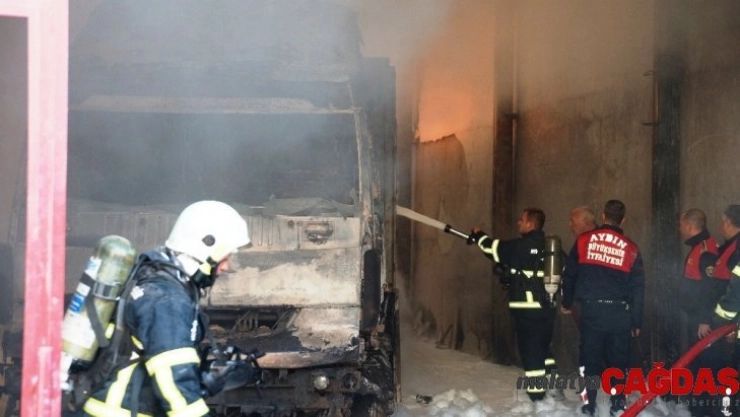 Aydın'ın Efeler ilçesinde ahşap palet işletmesinde çıkan yangın büyük maddi hasara yol açarken, işletme içerisinde bulunan bir tır tamamen yanarak kül oldu.