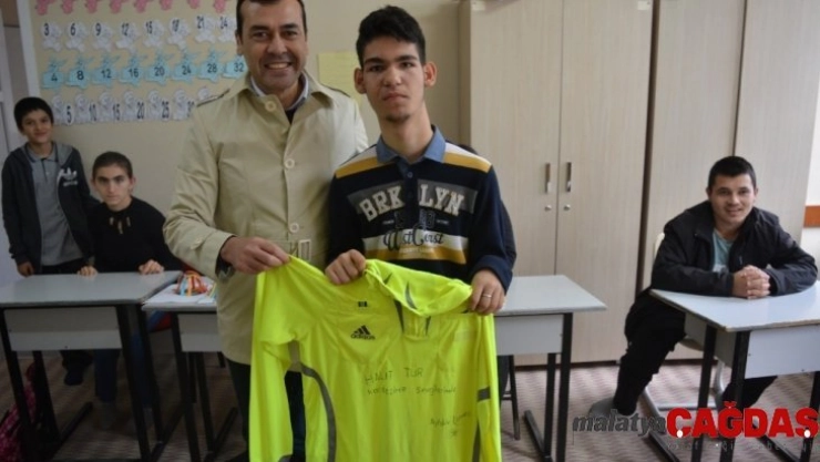 Balıkesir bölgesinin başarılı hakemi Aytekin Durmaz, Bigadiç’te hayranı olduğu engelli öğrenciyi okulunda ziyaret ederek, süper ligde giydiği hakem formasını hediye etti.