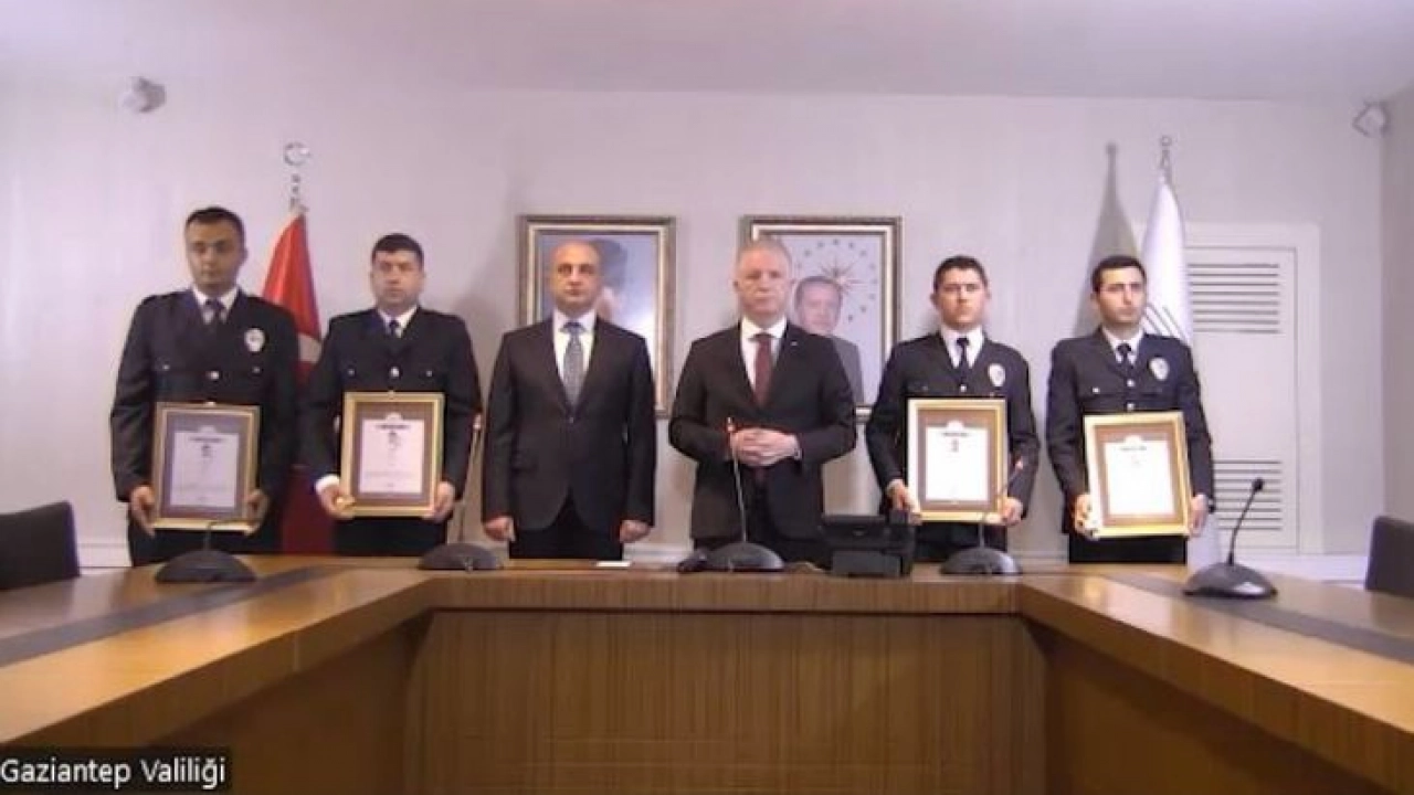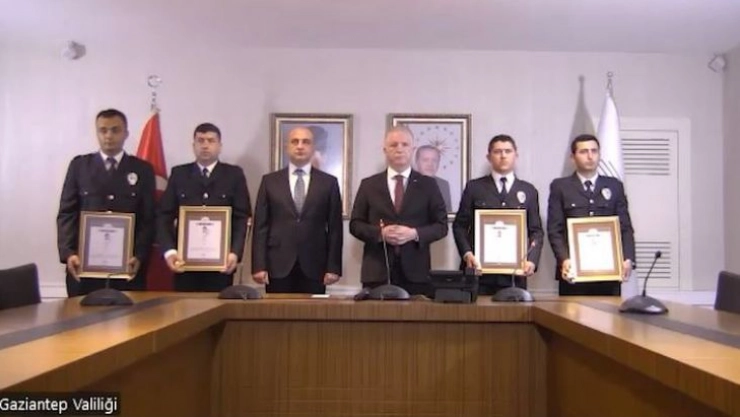 İçişleri Bakanı Süleyman Soylu, dün saat 17.10 sularında Gaziantep Emniyet Müdürlüğü önündeki saldırı girişimine anında müdahale ederek saldırgan şahsı etkisiz hale getiren polis memurları ile video konferans yöntemi ile görüşme gerçekleştirdi. Bakan Soylu, Gaziantep Emniyet Müdürlüğü ana giriş kapısı önünde sahte bomba düzeneği ile yapılan canlı bomba eylemine anında müdahalede bulunan polis memurları Yılmaz Ordu, Yılmaz Uyanık, Ali Kurt, Orhan Çelik ve bomba imha uzmanı Sinan Güneş ile görüştü. İçişleri Bakanı Soylu, bugün akşam saatlerinde kahraman polis memurları ile video konferans yöntemiyle bir görüşme gerçekleştirdi. Video konferansa Gaziantep Valisi Davut Gül ile birlikte İl Emniyet Müdürü Mustafa Emre Başbuğ ve ödüllendirilen polis memurları katıldı. Bakan Soylu, olaya müdahale eden polis memurlarını kutlayarak tek tek sohbet etti.