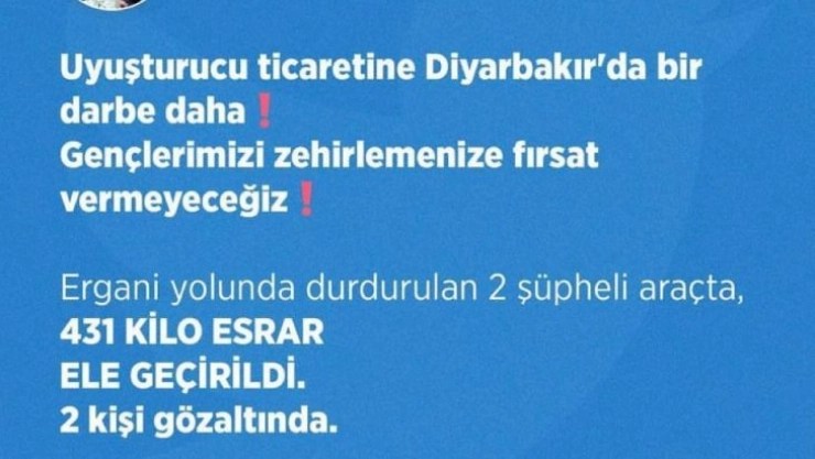 İçişleri Bakanı Süleyman Soylu, sosyal medya hesabından yaptığı paylaşımda, “Uyuşturucu ticaretine Diyarbakır’da bir darbe daha. Gençlerimizi zehirlemenize fırsat vermeyeceğiz. Ergani yolunda durdurulan 2 şüpheli araçta, 431 kilogram esrar ele geçirildi. 2 kişi gözaltına alındı. Diyarbakır Emniyetimize tebrikler” ifadelerine yer verdi.