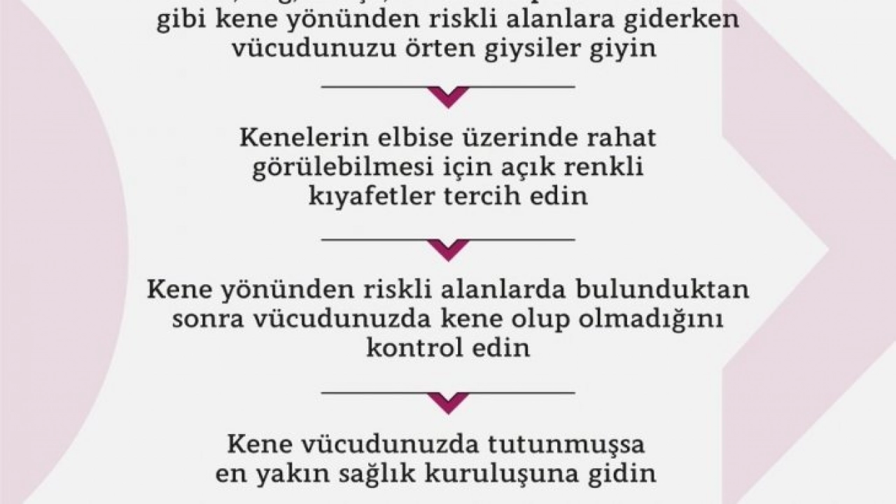 Riskli alanlarda bulunduktan sonra vücudun kontrol edilmesi gerektiği belirtilen açıklamada, kenenin vücuda tutunması halinde en yakın sağlık kuruluşuna gidilmesi uyarısında bulunuldu. Öte yandan kenenin vücuttan çıkarıldığı 10 gün içinde de halsizlik, iştahsızlık, ateş, kas ağrısı, baş ağrısı, bulantı, kusma veya ishal belirtilerinin görülmesi halinde tekrar bir sağlık kuruluşuna başvurmak gerektiği belirtildi.