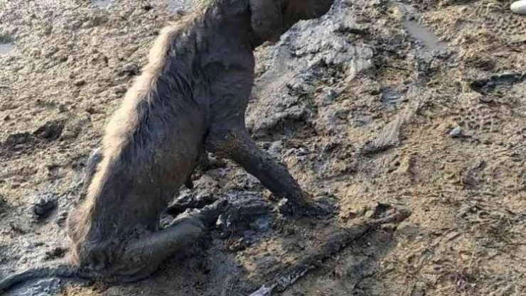 Adana'da balçığa saplanmış halde bulunan köpeği Adana Büyükşehir Belediyesi ekipleri kurtardı.