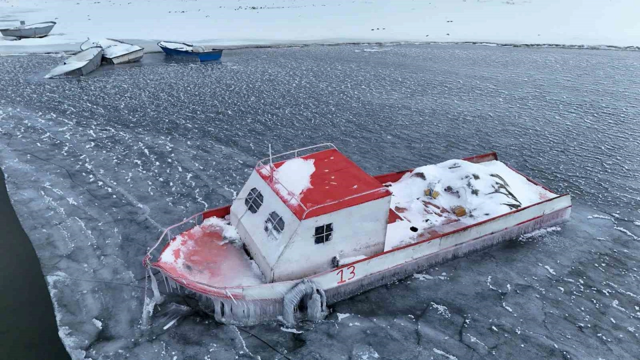 Nazik Gölü kısmen dondu, balıkçı tekneleri buzlar arasında kaldı