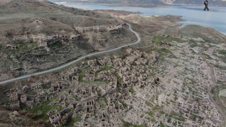 Kayseri’de Yamula Barajı’ndaki su seviyesinin düşmesi ile birlikte, baraj kıyısında bulunan eski köyde bulunan evler de gün yüzüne çıktı.