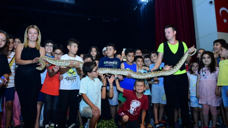 Büyük bir heyecana sahne olan gösterinin sonunda sahneye getirilen piton yılanına büyük ilgi gösteren çocuklar bol bol resim çektirip yaşadıkları mutluluğu kalıcı hale getirdiler.