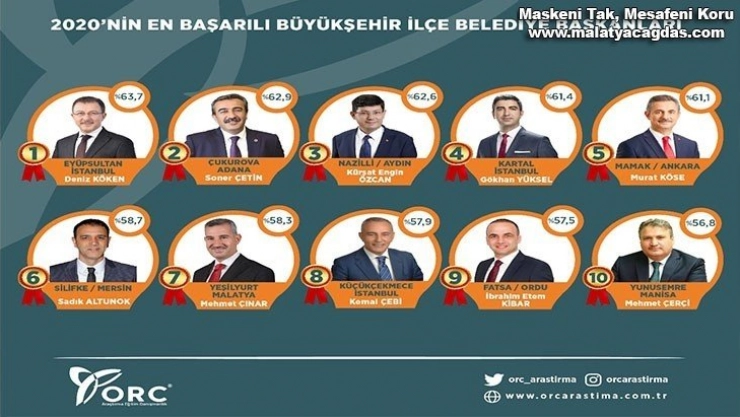 Yeşilyurt Belediye Başkanı Mehmet Çınar, ORC Araştırma Şirketi tarafından Türkiye genelinde 30 Büyükşehirde yapılan ‘2020’nin En Başarılı Büyükşehir İlçe Belediye Başkanları’ anketinde %58,3 oranıyla 7’nci sırada yer alırken, Doğu Anadolu’nun ise en iyi İlçe Belediye Başkanı seçildi.