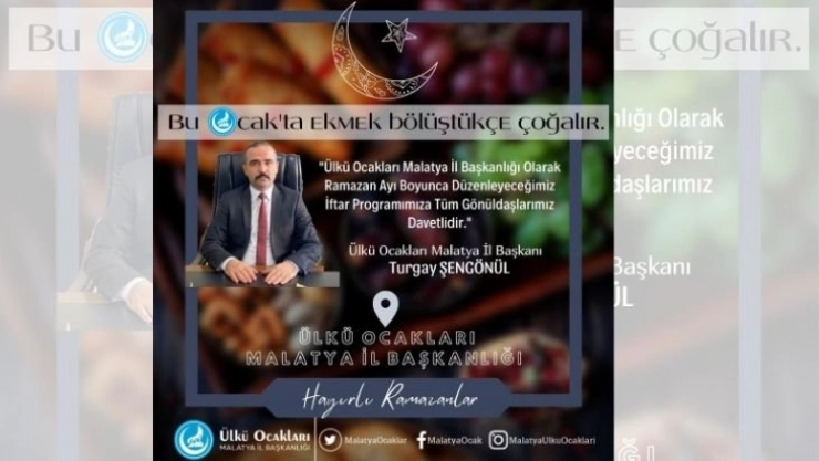 Programla ilgili açıklamalarda bulunan Ülkü Ocakları Malatya İl Başkanı Turgay ŞENGÖNÜL; “Ülkü Ocakları Malatya İl Başkanlığı olarak, Ülkücü şehit ağabeylerimiz ve bu vatan için gözünü kırpmadan canını feda etmiş tüm şehitlerimizin hayrına “ Bu Ocakta Ekmek Bölüştükçe Çoğalır” adıyla, kutlu dergahımız olan, Ülkü Ocakları İl Başkanlığımızda Ramazan Ayı boyunca iftar programı yapacağız.Yapacağımız bu programda, helal soframıza tüm gönüldaşlarımızı ve vatandaşlarımızı davet ediyorum” dedi.