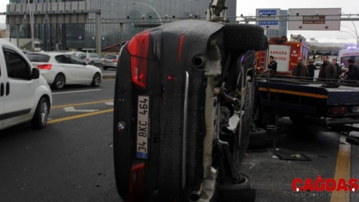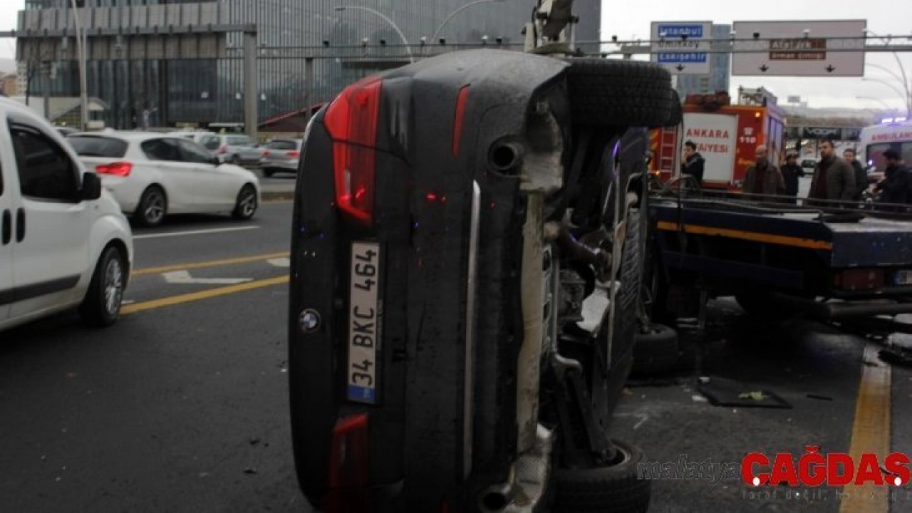 Ankara'da yağmurdan kaynaklı kaygan zeminde kayan otomobil aydınlatma direğine vurarak takla attı.