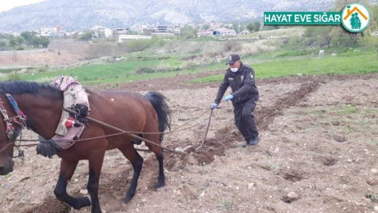 Adıyaman’ın Tut ilçesinde çarşı ve mahalle bekçisi, kara sabanla yaşlı bir vatandaşın tarlasını sürdü.