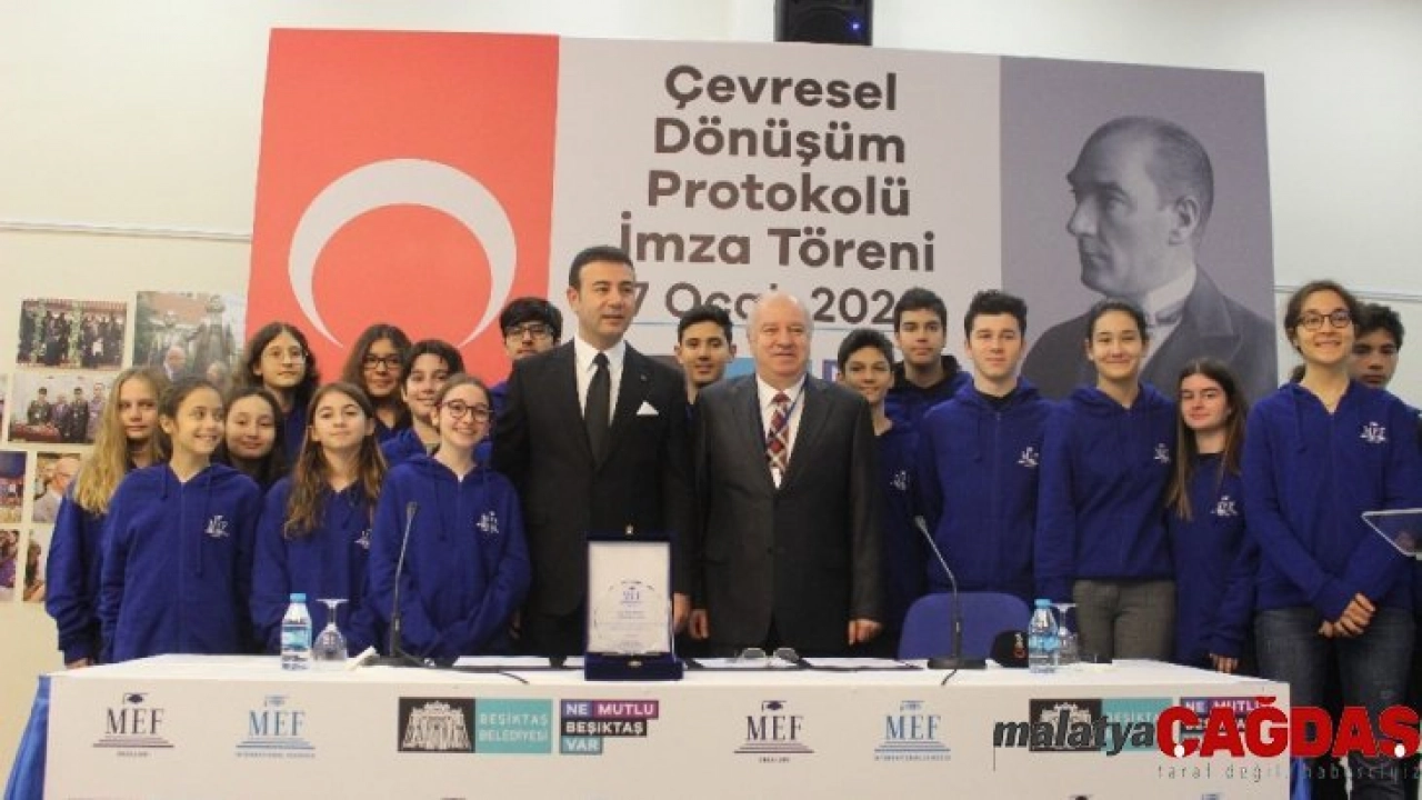 Beşiktaş Belediyesi ile MEF Okulları arasında Çevresel Dönüşüm Protokolü MEF Okullarında düzenlenen tören ile imzalandı. Beşiktaş Belediye Başkanı Rıza Akpolat’ın atıkların çevreye verdiği zararları azaltmak ve geri dönüşebilen malzemelerden fayda sağlamak amacıyla başlattığı projeye öğrenciler yoğun ilgi gösterdi.