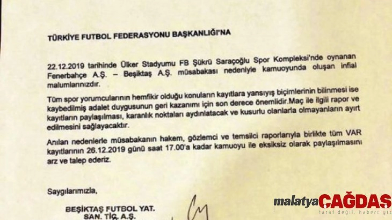 Beşiktaş’ın, Süper Lig’in 16. haftasında deplasmanda Fenerbahçe’ye 3-1 mağlup olduğu karşılaşmada siyah-beyazlı yönetim ve camia, mücadelenin hakemi Cüneyt Çakır ile Video Yardımcı Hakem (VAR) Mete Kalkavan’a yönetimlerinden dolayı tepki göstermişti. Tüm bu yaşananların ardından Beşiktaş Kulübü, derbideki hakem ve gözlemci raporlarıyla birlikte tüm VAR kayıtlarının açıklanmasına ilişkin TFF’ye başvuruda bulundu.
