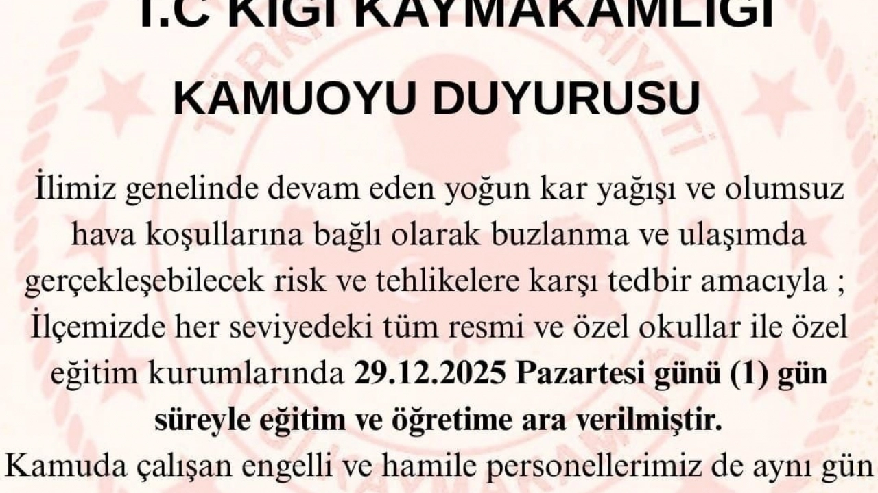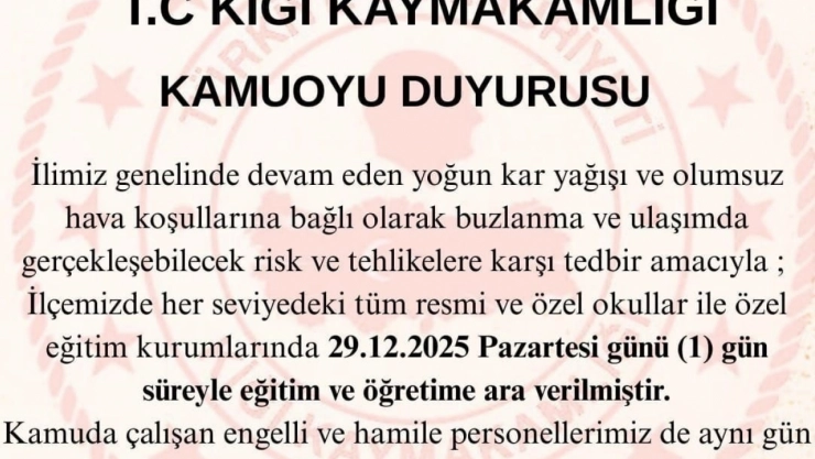 Kiğı Kaymakamlığı ve Adaklı Kaymakamlığı tarafından yapılan açıklamada, devam eden yoğun kar yağışı, buzlanma ve ulaşımda yaşanabilecek riskler nedeniyle tedbir amaçlı karar alındığı aktarıldı. Buna göre, 29 Aralık 2025 Pazartesi günü ilçelerdeki her seviyedeki tüm resmi ve özel okullar ile özel eğitim kurumlarında eğitim ve öğretime 1 gün süreyle ara verildiği bildirildi.