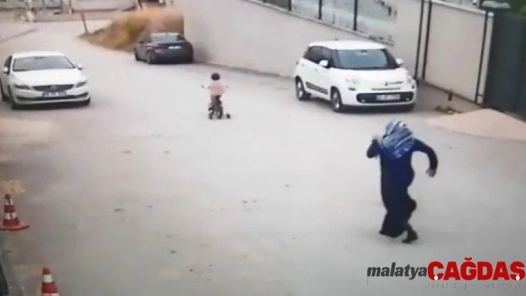 Edinilen bilgiye göre, annesi de yanında olduğu sırada sokakta bisiklete binen küçük kız aniden yokuşa doğru yöneldi. Biranda hızlanmaya başlayan bisiklete yetişmeye çalışan annenin yüreği ağzına geldi. Dört yol ağzının bulunduğu kavşağa doğru hızla ilerleyen bisikleti yakalamak için koşan ancak yetişemeyen annenin imdadına bir servis şoförü yetişti. Minibüsü olduğu yere park eden servis şoförü, küçük kızı hızlanan bisikletin üzerinden aldı. Soluk soluğa kızının yanına giden anne, büyük şok yaşadı. Yaşananlar ise bir okulun güvenlik kameralarına yansıdı.