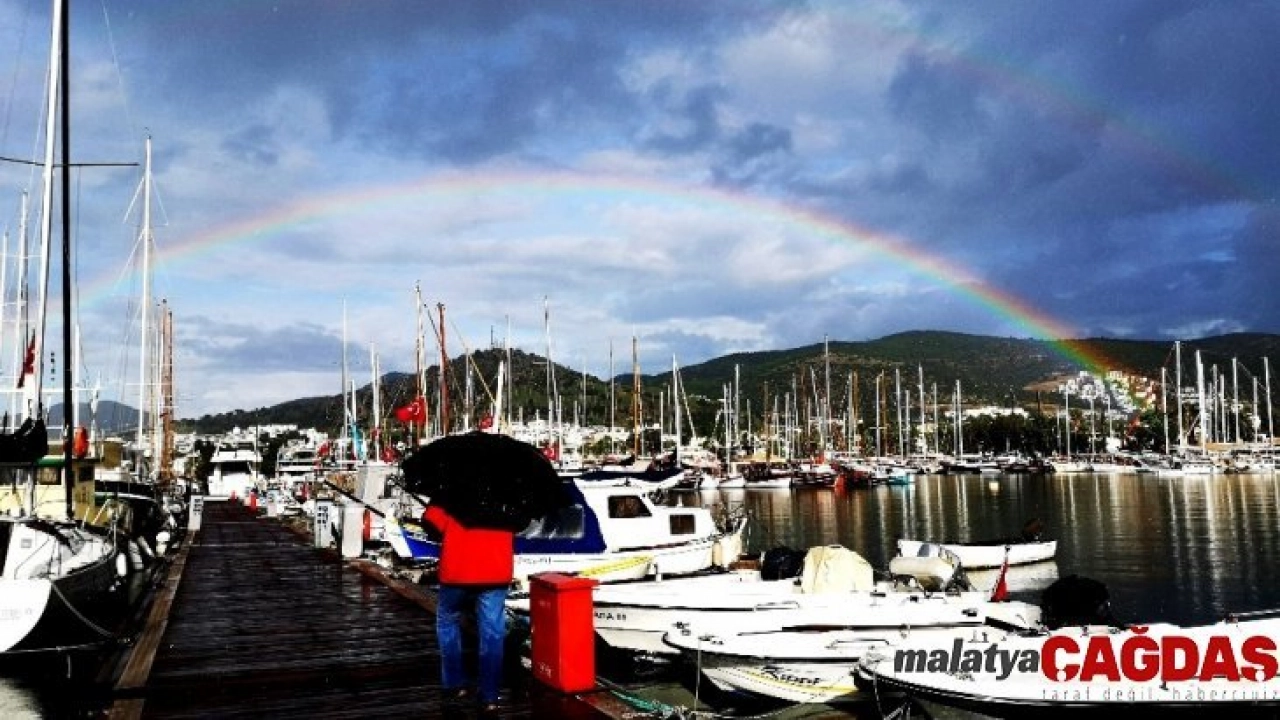 Muğla’nın Bodrum ilçesinde yağmurun ardından çıkan çift gökkuşağı görenleri kendine hayran bıraktı.