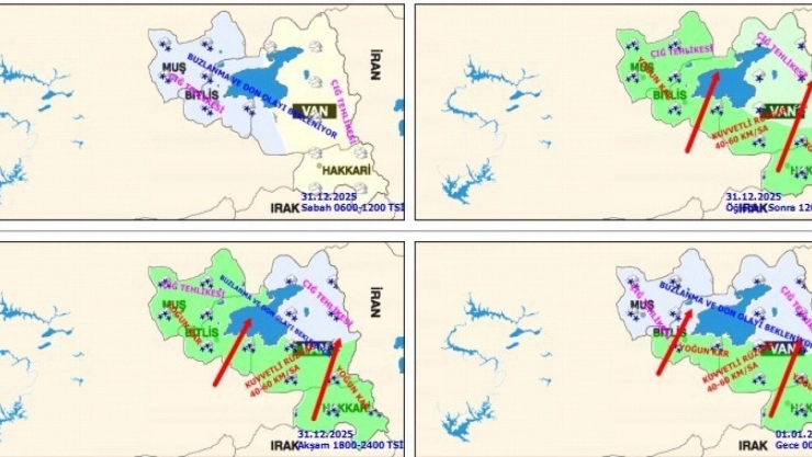 Meteoroloji 14. Bölge Müdürlüğünden alınan bilgilere göre, yapılan son değerlendirmede bölge genelinde havanın çok bulutlu, sabah saatlerinden itibaren Muş ve Bitlis çevrelerinde, öğle saatlerinden itibaren ise Van ve Hakkari çevrelerinde aralıklı kar yağışlı olacağı belirtildi. Yağışların öğle saatlerinden sonra yer yer kuvvetli ve yoğun kar şeklinde etkisini artıracağı dile getirilen açıklamada, "Hava sıcaklıklarının mevsim normalleri civarında seyredeceği tahmin edilmektedir. Rüzgarın güneyli ve batılı yönlerden orta kuvvette, öğle saatlerinden itibaren zaman zaman kuvvetli rüzgar (40-60 km/sa) şeklinde esmesi beklenmektedir. Sabah ve gece saatlerinde buzlanma ve don olayı ile yer yer sis ve pus hadisesi beklendiğinden yaşanabilecek olumsuzluklara (ulaşımda aksamalar, görüş mesafesinde daralma vb.) karşı dikkatli ve tedbirli olunması gerekmektedir. Sabah saatlerinde başlaması beklenen yağışların öğle saatlerinden itibaren etkisini arttırarak Muş, Bitlis ve Hakkari çevreleri ile Van’ın güney (Edremit, Bahçesaray, Çatak, Gevaş, Gürpınar ve Başkale) ilçelerinde aralıklarla kuvvetli ve yer yer yoğun kar yağışlı olacağı tahmin edilmektedir. Yaşanabilecek olumsuzluklara karşı dikkatli ve tedbirli olunmalıdır. Bölgemizde yüksek kar örtüsü bulunan dik yamaçlarda çığ tehlikesi bulunduğundan yaşanabilecek olumsuzluklara karşı dikkatli ve tedbirli olunması gerekmektedir. Öğle saatlerinden itibaren bölgemiz genelinde rüzgarın güneyli yönlerden kuvvetli (40-60 km/sa), yüksek kesimlerde fırtına (60-80 km/sa) şeklinde esmesi beklendiğinden yaşanabilecek olumsuzluklara karşı dikkatli ve tedbirli olunmalıdır" denildi.