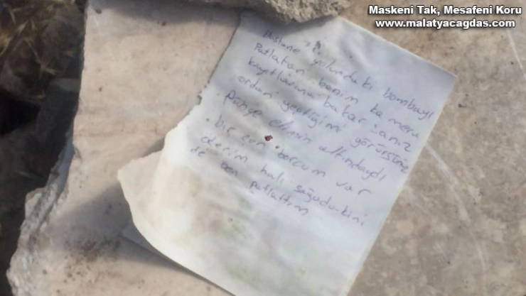 Olay yerinde inceleme yapan jandarma ekipleri araç yakınında yol kenarında bir not buldu. Notta, “Hastane yolundaki bombayı patlatan benim. Kamera kayıtlarına bakarsanız oradan geçtiğimi görürsünüz. Fünye elimin altındaydı. Bir can borcum var öderim. Halı sahadakini de ben patlattım. Konutlar mevkisindeki bombayı patlatan benim. Bir de aynı mıntıkadaki okul arkasındakini de” yazıldığı görüldü.