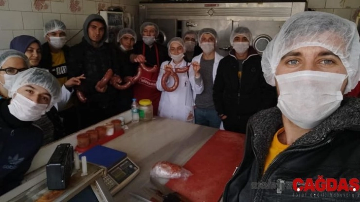 Gıda Teknolojisi Bölümü öğrencileri Et Teknolojisi dersi kapsamında öğretmenleri Gözde Çelikeloğlu eşliğinde ilçe kasabı Ahmet Demirel’e misafir oldular. Yaklaşık üç saat süren uygulamalı anlatımda işletme yetkilisi Ahmet Demirel bilgilerini ve becerilerini öğrencilerle paylaştı ve öğrencilere püf noktalarıyla beraber geleneksel yöntemle sucuk üretimini anlattı.