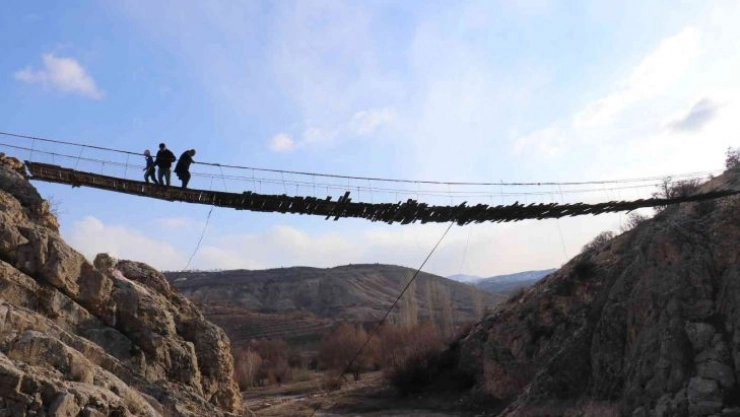 Malatya'nın Akçadağ ilçesi Levent Çayı üzerinde bulunan 30 metre yüksekliğindeki çelik halatlı tahta köprü, görüntüsüyle yürekleri ağza getiriyor.