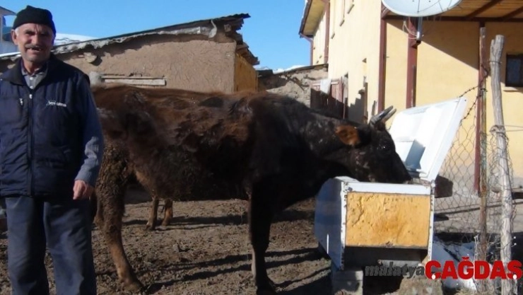 Van'ın Erciş ilçesinin Ulupamir Mahallesi'nde büyükbaş hayvan besleyen Elbab Şah isimli vatandaş, buzdolabından yaptığı sıvatla hayvanlarına su içiriyor.