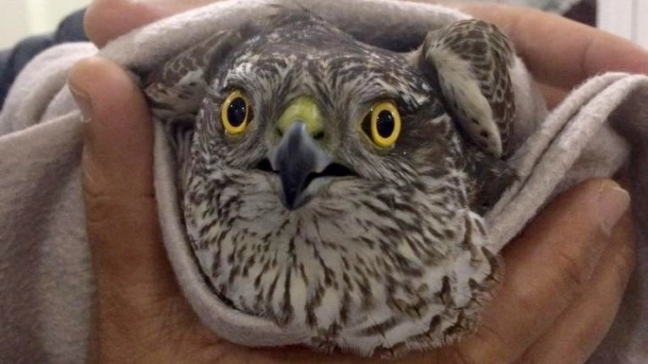 Cama çarpan yavru atmaca battaniyede ısıtıldı