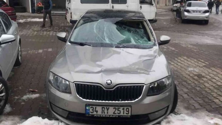 Çatılardan düşen kar birikintileri, araçlarda maddi hasara neden oldu