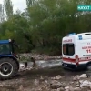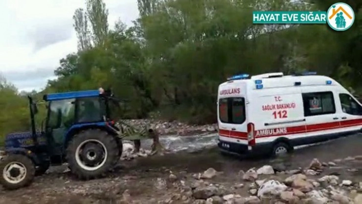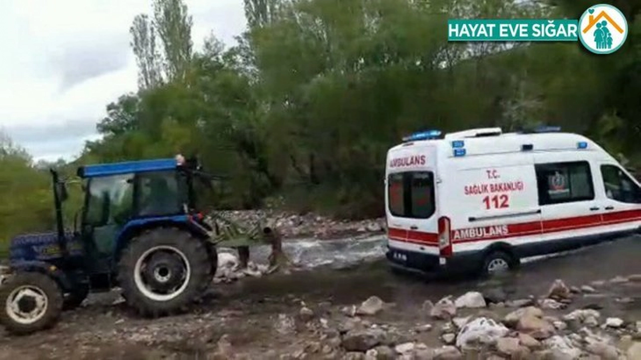 Adıyaman'da bir hastaya müdahale için giden ambulans çaydan geçerken mahsur kalınca yardımına köylüler traktörle yetişti.