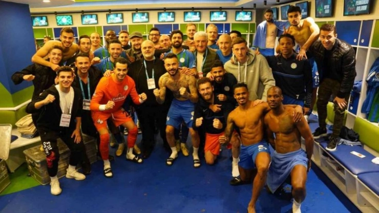 Göztepe karşısında 3-1’lik skorla galip gelen Çaykur Rizespor’un, galibiyet pozuna bu kez kulüp başkanı Tahir Kıran da katıldı.