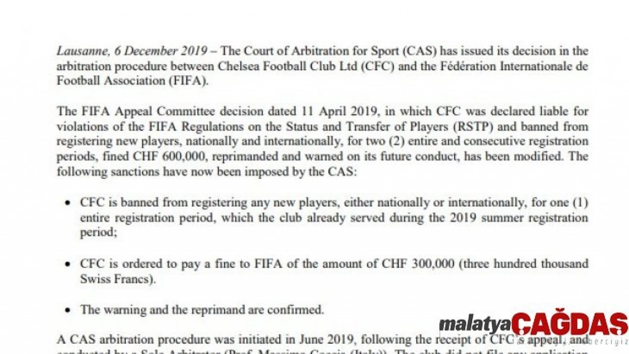 Uluslararası Spor Tahkim Mahkemesi (CAS), Chelsea'nin transfer yasağını kaldırdı. Böylelikle İngiliz ekibinin Ocak ayı için transfer tahtası açılmış oldu.
