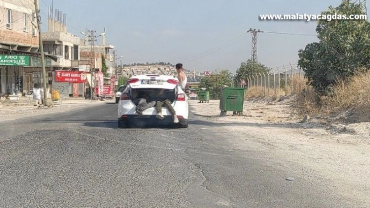 Şanlıurfa’da seyir halindeki otomobilin bagajında oturan 2 çocuğun tehlikeli yolculuğu cep telefonu kamerasına yansıdı.