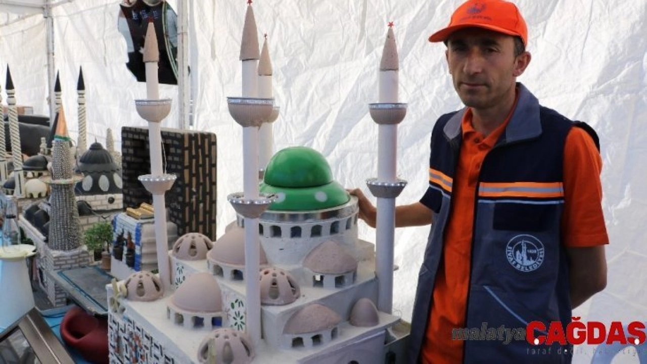 Sivas Belediyesi Temizlik İşleri Müdürlüğünde çalışan 38 yaşındaki Murat Uçar, 3 yıl içerisinde çöplerden topladığı atık malzemeleri değerlendirmeye karar verdi. Uçar, atık malzemelerle; Çifte Minareli Medrese, Kale Cami, Gök medrese gibi şehrin tarihi eserlerinin de içinde bulunduğu birçok maket yaptı. Çöpten çıkan eserler ise bugün Kongre Müzesi bahçesinde düzenlenen sergide meraklılarla buluştu. Sergiyi gezen Sivas Belediyesi Başkanı Hilmi Bilgin ve Sivas Valisi Salih Ayhan Uçar’a altın hediye etti.