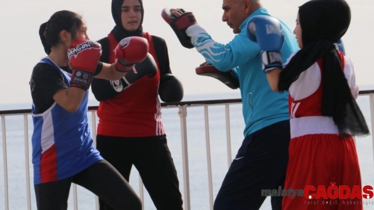 Yaşları 12 ile 17 arasında değişen kız öğrencilerle sadece salonda antrenman yapmayan Hasan Altıntaş, sporcularını kumla kaplı dünyaca ünlü Konyaaltı Sahili’nde toplayarak çalıştırıyor. İlk olarak sahilde koşu yapan sporcular, ısınma hareketlerinin ardından, eldivenlerini giyerek gölge boksu yapıyor. Teknik ve taktik ağırlı çalışmaların ardından sporcular, güç depolamayı da ihmal etmiyor.