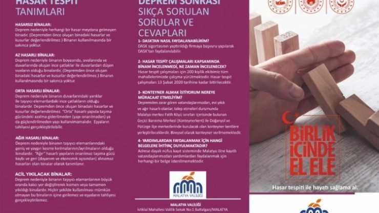 Malatya Valiliği tarafından depremzedeleri ve vatandaşları bilgilendirme amacıyla broşür bastırıldı. Broşürlerde, “Birlik İçinde El Ele” başlıklı broşürde; “Hasar tespit tanımları”, “Deprem sonrası sıkça sorulan sorular ve cevapları”, “Hasar tespit nedir?” konularında ki sorulara cevaplar bulunuyor ve aydınlatıcı bilgiler yer alıyor.