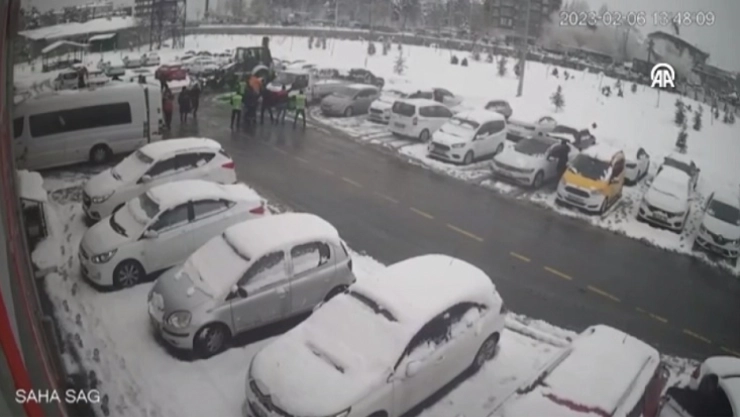 Görüntüde deprem anında Büyükşehir Belediyesi İtfaiye Daire Başkanlığı otoparkına sığınan depremzedelerin kaçışması yer alırken, arka tarafta ise blokların yıkılması görülüyor.