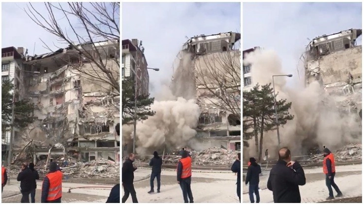 Malatya'da depremden dolayı ağır hasar alan bina, yıkım esnasında çöktü. Çökme anı ise amatör kameralara yansıdı.