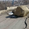Depremle oluşan heyelanda dev kayalar yola düştü