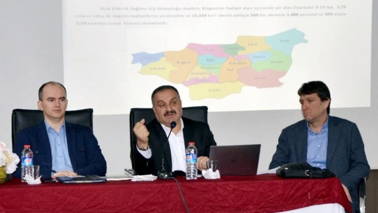 Toplantının açılış konuşmasını yapan Kaymakam ve Belediye Başkan Vekili Yasin Yunak, sorun ve taleplerin diyalog yoluyla çözülmesi gerektiğine dikkat çekti. Ardından söz alan Dicle Elektrik Dağıtım AŞ Genel Müdürü Murat Karagüzel, şirketin çalışmaları hakkında bilgiler verdi. Dicle Elektrik’in dağıtım hizmeti sunduğu 6 ilde yaşayan 6.2 milyon nüfusa 6 bin 500 personel ve bin 300 araçla hizmet verdiğini ifade eden Karagüzel, yaklaşık 7 yıl içerisinde bölgede 2.6 milyar liralık yatırım yaptıklarının altını çizdi. Özelleştirmeden önce bölge illerinde yıllık ortalama 120 milyon liralık olan yatırım miktarını özelleştirme sonrasında 3 kattan fazla artırarak 375 milyon liraya çıkardıklarını kaydeden Karagüzel, şebekeler yenilendikçe arıza sayısının azaldığını böylece daha kaliteli ve kesintisiz enerji verdiklerini söyledi. Enerji verimliliğine özel bir önem verdiklerini ifade eden Karagüzel, yapılan çalışmalar sayesinde, özelleştirmenin gerçekleştiği 2013’te yüzde 78’ler düzeyinde olan kayıp kaçak oranının yüzde 51’e çekildiğini söyledi.