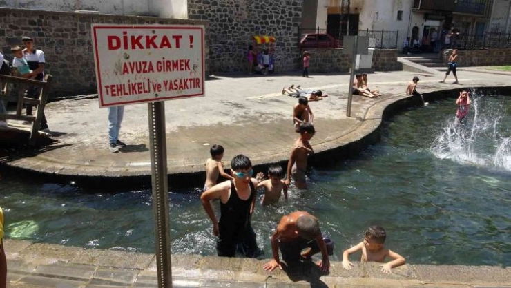 Diyarbakır’da yaz aylarının gelmesiyle beraber termometreler 40 dereceyi aşınca kavurucu sıcaklar vatandaşları bunalttı. Caddelerde asfaltlar buharlaşınca Sur ilçesinde sıcak havayı fırsat bilen çocuklar, hem serinlemek hem de eğlenceli zaman geçirmek için Anzele Parkı’ndaki havuza girdi, aileleri ise gölgede çocukları izleyerek serinledi. Girilmesi tehlikeli olmasına rağmen suya atladığı görülen çocuklar, havuzdan çıkarak beton zemine uzanıp güneşlendi.