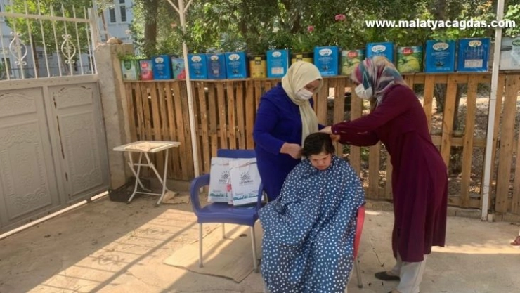 Down sendromlu Aysun'u evinde ziyaret eden Adıyaman Belediyesi Kadın ve Gençlik Merkezi kursiyerleri, genç kızın saç bakımını yaptı.