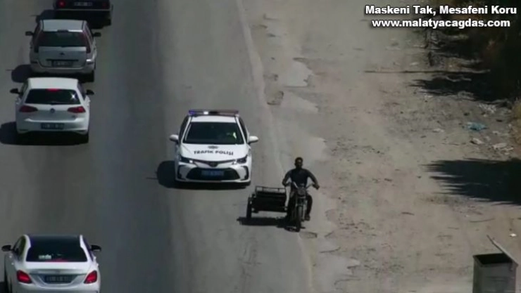 Hatay'da plakasız sepetli motosikleti ile trafik ekiplerini fark ederek ters yönde kaçmaya çalışan sürücü, kovalamaca sonucu yakalandı.