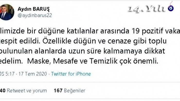 Yeni tip korona virüs (Covid-19) salgını ile mücadele sonrasında, maske ve sosyal mesafe kuralları çerçevesinde 1 Temmuz itibariyle açılan düğün salonlarında yetkililerin uyarıları dinlenmedi. Malatya’da da bir düğüne katılan davetlilerden 19’unda korona virüs tespit edilince, sosyal medya hesabından açıklama yapan Malatya Valisi Aydın Baruş, vatandaşları uyardı. Baruş, mesajında, “İlimizde bir düğüne katılanlar arasında 19 pozitif vaka tespit edildi. Özellikle düğün ve cenaze gibi toplu bulunulan alanlarda uzun süre kalmamaya dikkat edelim. Maske, mesafe ve temizlik çok önemli” diyerek kurallara rivayet edilmesini istedi.