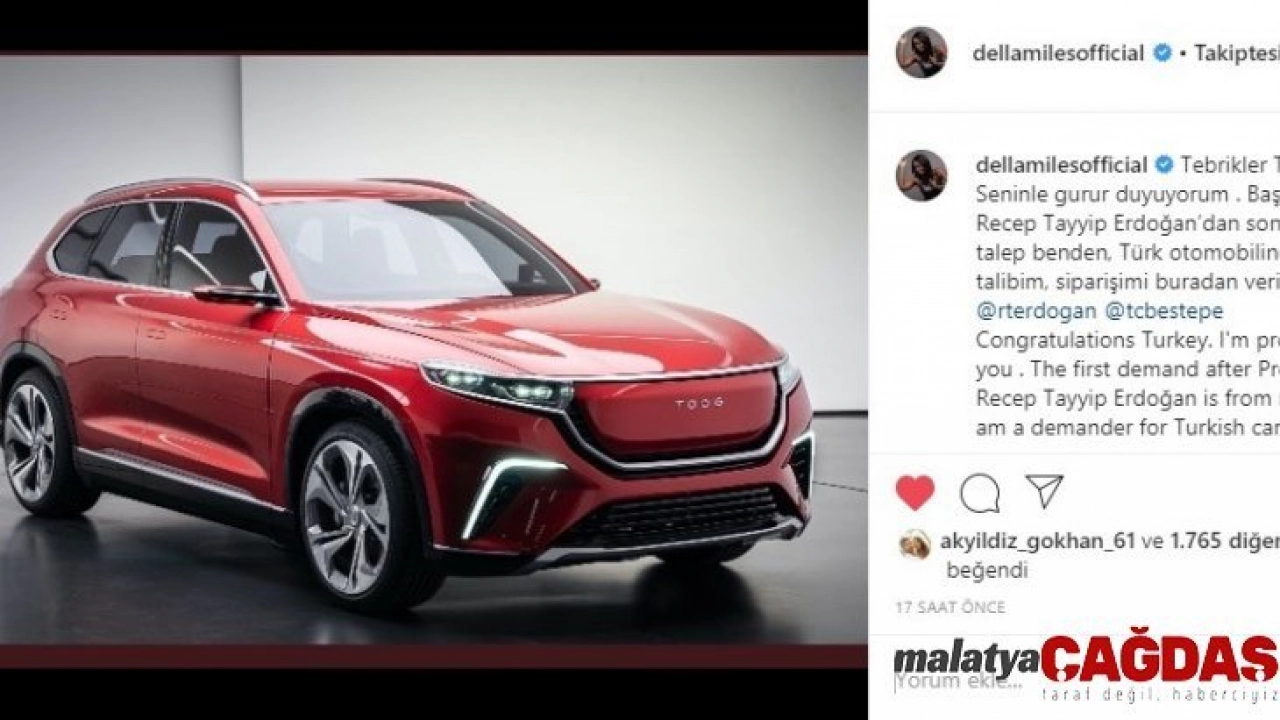 Verdiği konser nedeniyle birkaç gün önce Eskişehir’de de bulunan Della Miles, dün Cumhurbaşkanı Recep Tayyip Erdoğan tarafından tanıtımı yapılan yerli otomobille ilgili sosyal medya hesabı üzerinden bir paylaşım yaptı. Türkiye’ye yerleştikten sonra Müslüman olan ABD’li şarkıcı Della Miles, İngilizce ve Türkçe olarak yaptığı paylaşımda yerli otomobil için Türkiye’yi tebrik ederek kendi siparişini de verdi. Della Miles otomobilden bir fotoğraf paylaşarak, “Tebrikler Türkiye. Seninle gurur duyuyorum. Başkan Recep Tayyip Erdoğan’dan sonra ilk talep benden, Türk otomobiline talibim, siparişimi buradan veriyorum” diye yazdı.