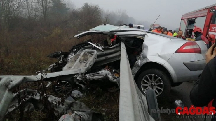 Düzce'de, TEM Otoyolu'nda seyir halindeyken kontrolden çıkan otomobil bariyerlere saplandı. Hurdaya dönen otomobilde sıkışan sürücünün yanında bulunan nişanlısı, kurtarma çalışması sırasında, 'Sevdiğime bir şey olmasın' diye feryat etti.