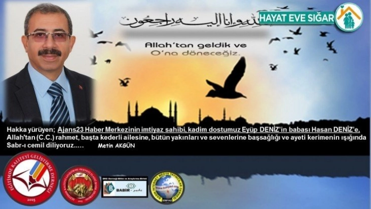 Ajans23 Haber Merkezinin imtiyaz sahibi Eyüp DENİZ’in babası Hasan DENİZ’in, Rahmet-i Rahmana kavuştuğunu öğrendik.
