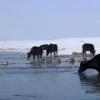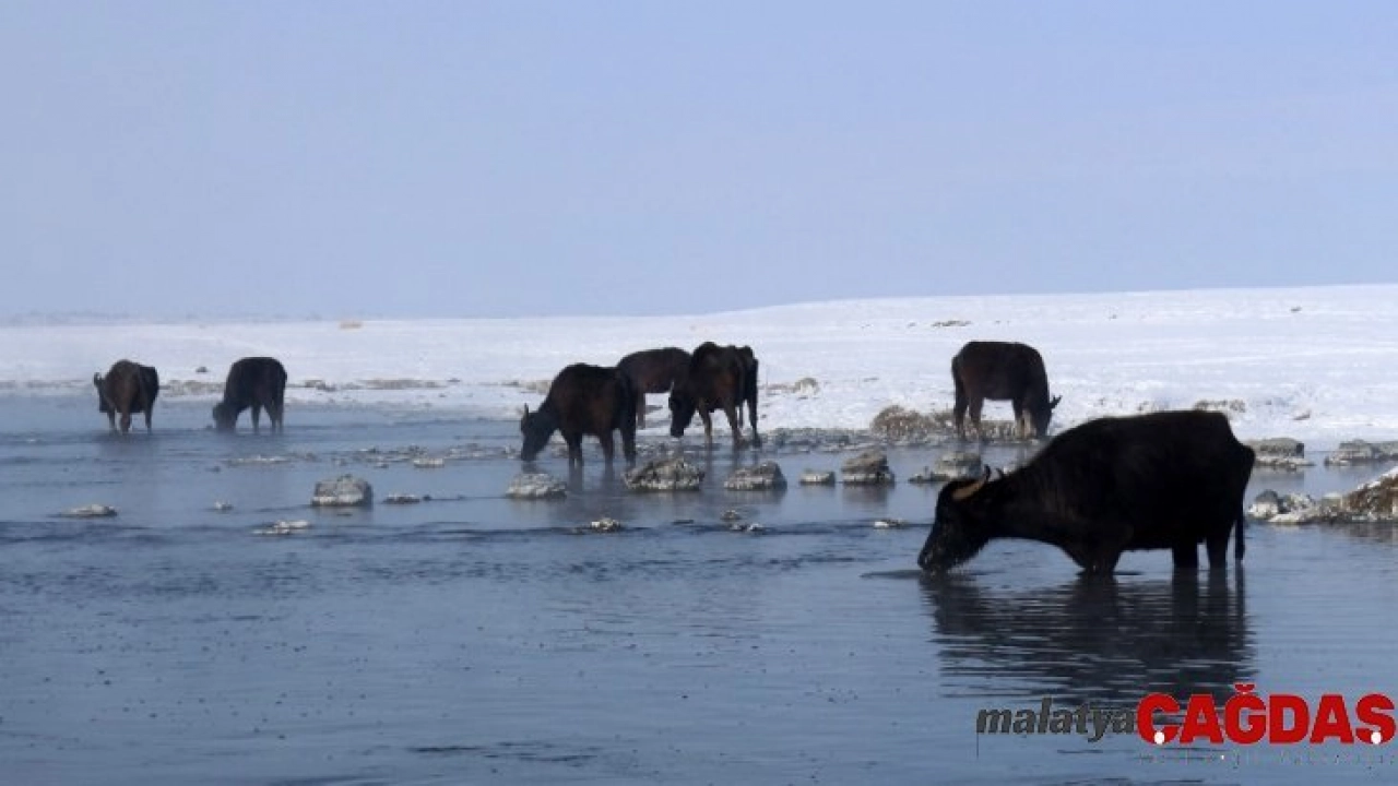 Çaldıran-Doğubayazıt yolu üzerinde bulunan Kaz Gölü’nün sularında otlanan mandalar, sabah sahipleri tarafından bölgeye getiriliyor. Kış mevsiminin en çetin geçtiği yerleşim yerlerinin başında gelen ve kış mevsimi süresince hava sıcaklığının bazen sıfırın altında 35-40 dereceye kadar düştüğü ilçede, besiciler ilginç yöntemlerle hayvanlarını besliyor.