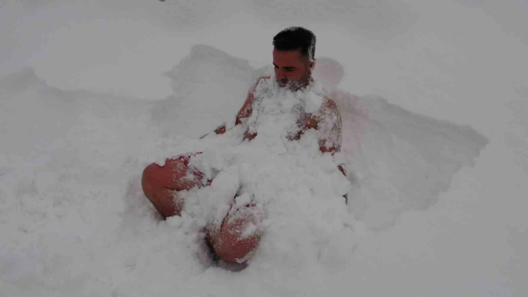 Van'da etkili olan dondurucu soğuklara rağmen eksi 8 derecede içi kar dolu havuzda kulaç atıp kar banyosu yaparak eğlenceli anlar yaşadı.